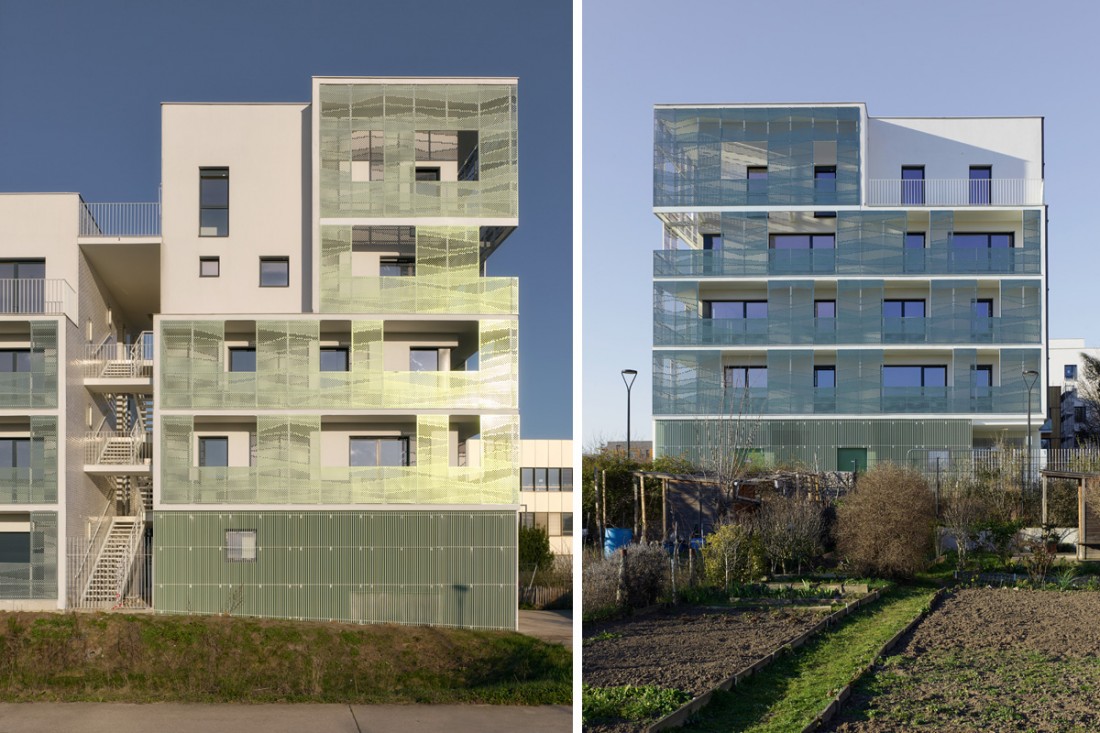 La volumétrie sur la façade ouest sculpte, en cime du bâti, une silhouette urbaine découpée sur la promenade piétonne. Le bâti offre un épannelage varié en R+3 avec deux émergences à R+4. Cet épannelage est accentué par une seconde enveloppe faisant osciller la cime des bâtis de R+2 à R+4. Cette enveloppe est matérialisée par une résille en aluminium de ton bleu-vert à perforations variables rappelant les couleurs aquatiques. Le métal est un matériau brillant qui capte les rayons du soleil et les morceaux de paysage. Léger, façonné, plié, découpé, lumineux, le métal mute au grès du temps, des saisons et des heures de la journée. La façade ondule en accompagnant le promeneur.